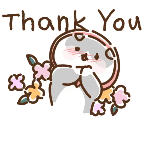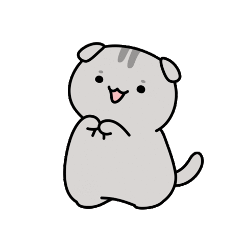 A cute cartoon grey cat stands on its hind legs, making a pleading or thanking gesture with its paws.