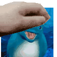 A human hand gently pets the head of the beloved blue dolphin character, Finfin, in a sweet animated moment.