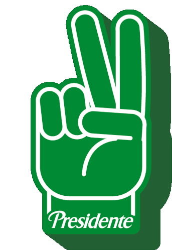 Green Presidente foam finger changes from crossed fingers for luck to a peace sign, symbolizing victory or good wishes.