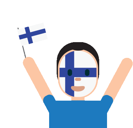 A cheerful Finnish fan with the national flag painted on their face, holding a small flag and celebrating enthusiastically.