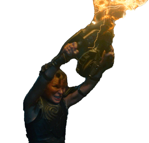 Milla Jovovich as Artemis in Monster Hunter, wielding a powerful, flaming sword engulfed in fire and electricity.