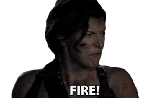 Alice, portrayed by Milla Jovovich from Resident Evil, intensely shouts 'FIRE!' in this action-packed sticker.