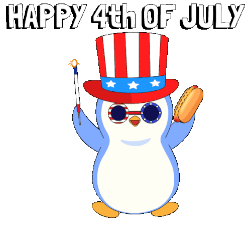a penguin in an uncle sam hat holding a hot dog
