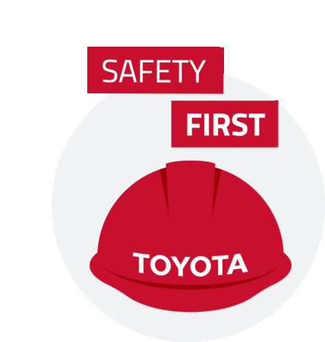 Animated sticker featuring a red Toyota hard hat with 'SAFETY FIRST' banners, emphasizing workplace safety.