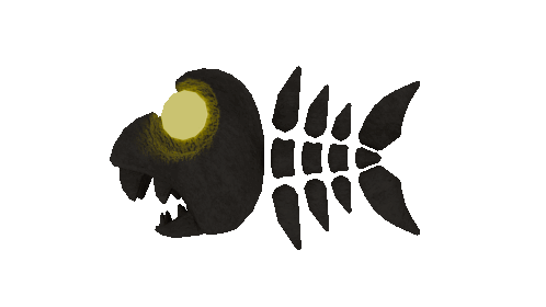 An animated skeletal fish bone with glowing yellow eyes and sharp teeth, reminiscent of characters from Mario Kart.