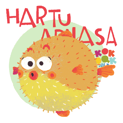 A Kokoak pufferfish blows bubbles with 'Hartu Arnasa' (Take a Breath) text, promoting relaxation.