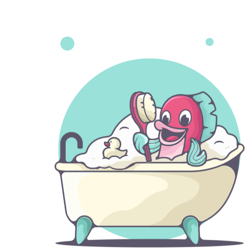 A happy cartoon fish enjoys a relaxing bubble bath with a rubber duck, scrubbing itself clean.