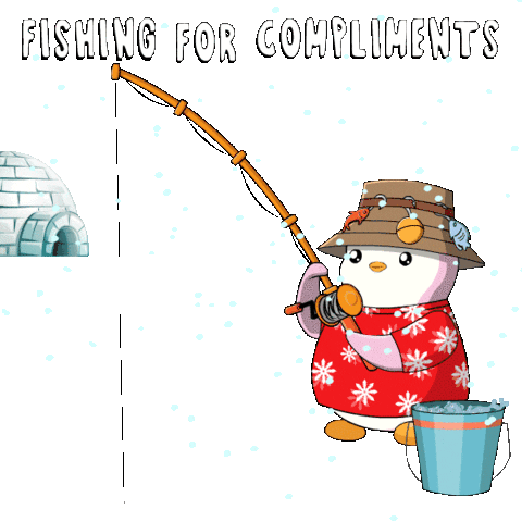 A cute pudgy penguin in a Hawaiian shirt and hat, fishing for compliments in a snowy landscape.