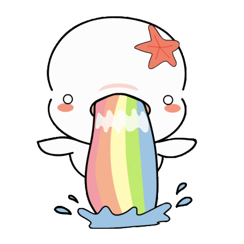 Adorable cartoon whale-like creature with a starfish on its head, vomiting a vibrant rainbow.