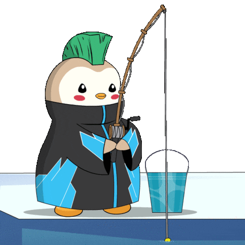 A cute pudgy penguin with a green mohawk patiently fishes with a rod and bucket.