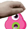 A pixel art hand gently pets Fishlips, the pink monster from Moshi Monsters, known for its distinctive lips.