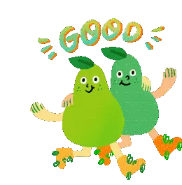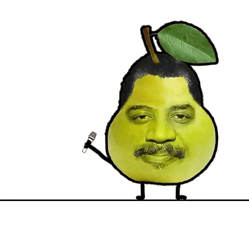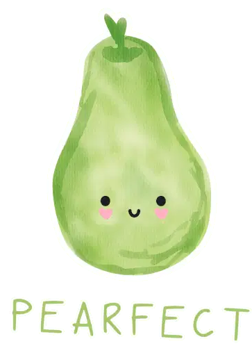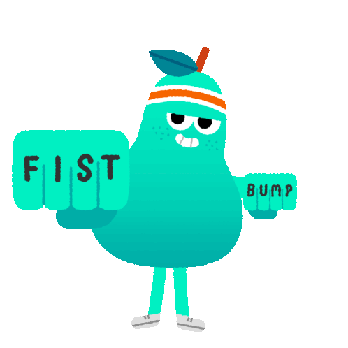 A cheerful teal pear character with a headband performs a fist bump, with 'FIST' and 'BUMP' written on its hands.