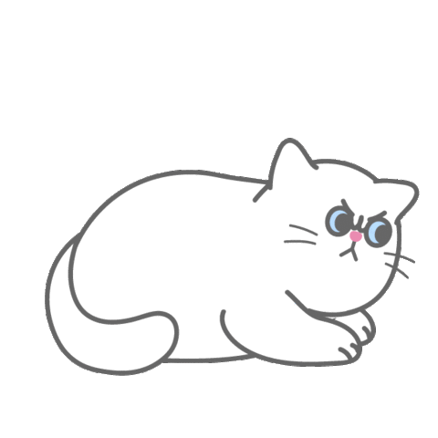 An angry white cartoon cat lies down, snarling with narrowed eyes and twitching tail, showing irritation and frustration.