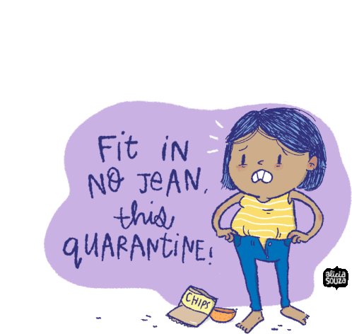 Alicia Souza's sticker depicts a person struggling to fit into jeans during quarantine, with chips nearby, humorously reflecting weight gain.