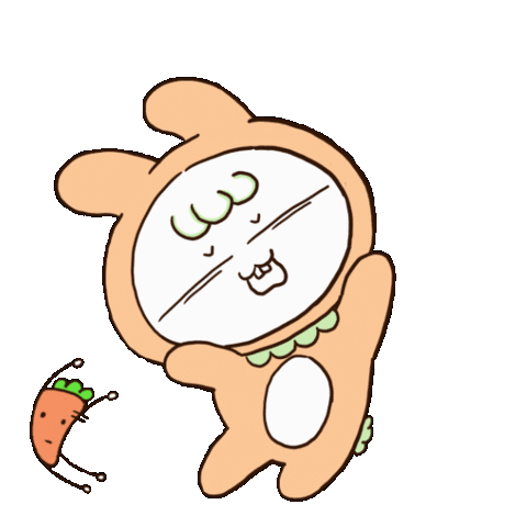 A cute cartoon bunny in an orange suit dances happily with a small, animated carrot character.
