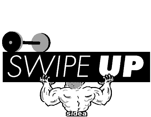 A muscular cartoon man holds a 'SWIPE UP' banner, promoting fitness content. A dumbbell is visible, emphasizing a workout theme.