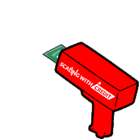 A red money gun labeled 'Scaling with Credit' shoots out dollar bills, symbolizing financial growth and debt management.