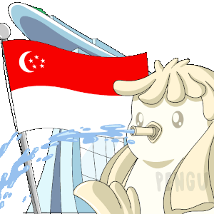 a cartoon drawing of a statue with a flag in the background
