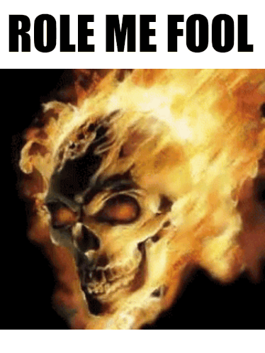 An animated flaming skull with flickering flames, featuring the bold caption 'ROLL ME FOOL' below it.