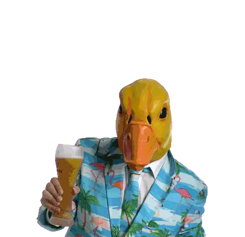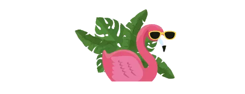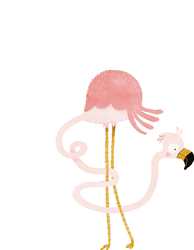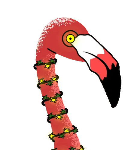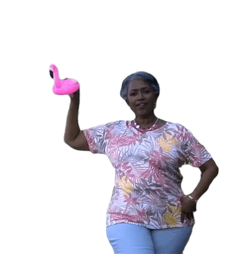 A woman holds up a pink flamingo toy, flaunting it with a stylish pose, referencing Barb And Star Go To Vista Del Mar.