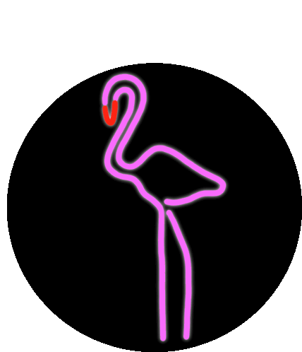 A vibrant neon pink flamingo outline with a red beak, glowing against a dark circular background.