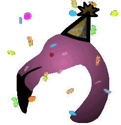 A pink flamingo head wearing a festive party hat, surrounded by colorful falling confetti, celebrating a birthday.