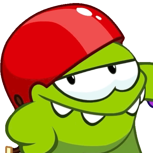 Om Nom, the green character from Cut the Rope, winks and flashes an eyebrow while wearing a red helmet.