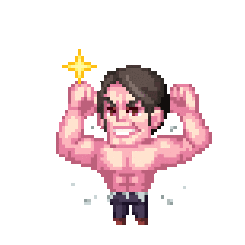 A pixel art man with glasses and a tie proudly flexes his bicep, showing off his muscle.
