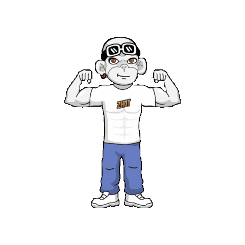 A strong white monkey character, wearing a 'ZHOT' shirt, proudly flexes its biceps, showcasing its impressive muscles.