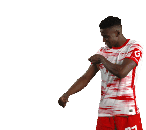 Nordi Mukiele, wearing his RB Leipzig jersey, proudly flexes his biceps, showing off his muscular physique.