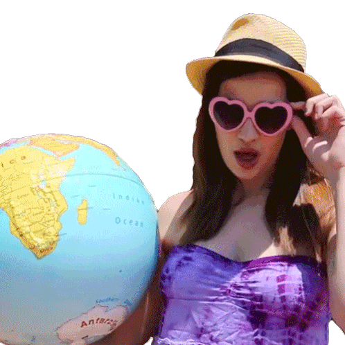 Marissa Rachel, wearing a hat and heart-shaped sunglasses, flirts while holding a globe. She looks playful and seductive.