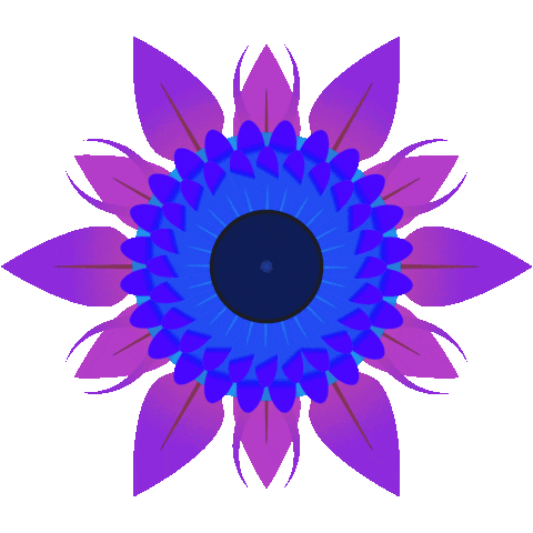 A vibrant animated flower with purple and blue petals rotates and pulses in a mesmerizing, symmetrical pattern.