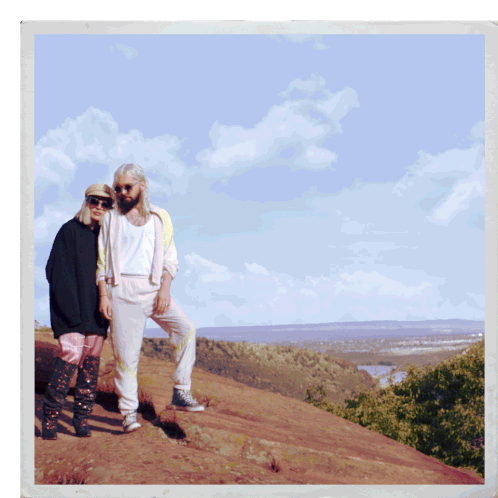 Flora Cash, the musical duo, stands on a scenic hilltop, evoking feelings of love and missing home, as seen in their "Missing Home" theme.