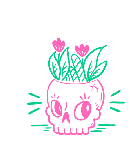 Animated skull vase with flowers and the word "Flourish" appearing, symbolizing growth, prosperity, and well-being.