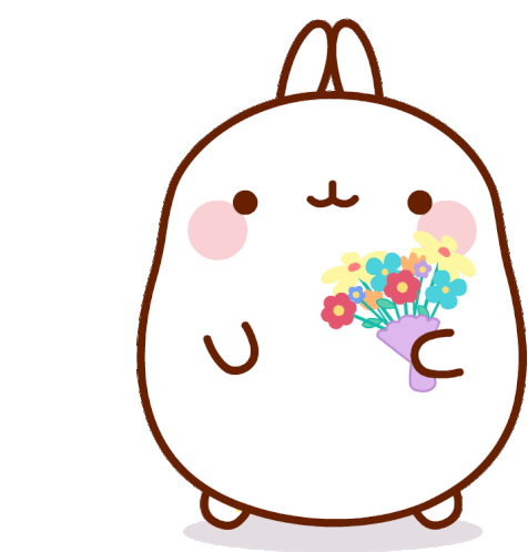 Molang, the adorable cartoon rabbit, happily holds a vibrant bouquet of colorful flowers, spreading joy.