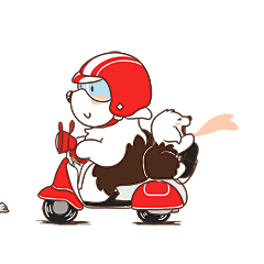 A fluffy cartoon character in a red helmet rides a scooter with a small dog enjoying the ride on the back.