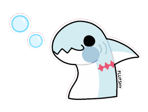 A cute, light blue cartoon shark character, Flufshy, blowing two playful bubbles. Perfect for adding a touch of cuteness.