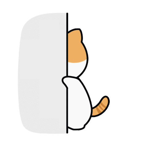 An adorable animated cat peeks from behind a wall, blushes, and gives a shy, modest smile before hiding again.