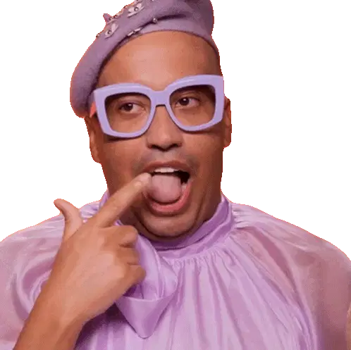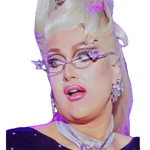 Nehellenia from RuPaul's Drag Race gives a captivating flirty look, slowly raising her gaze with fluttering eyelashes and a knowing smile.