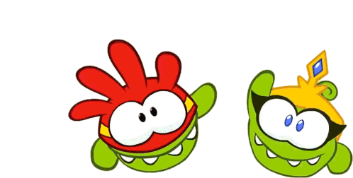 Om Nom and Om Nelle from Super Noms fly and glide, waving cheerfully. A fun animated sticker for greetings.