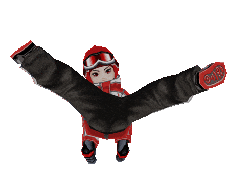 An animated 3D model of a red, white, and black snowboarder set from the game Flyff, performing a dance.