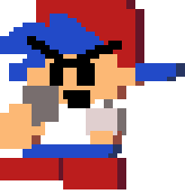 Animated pixel art sticker of BF from FNF, wearing sunglasses and a hat, holding a gun.