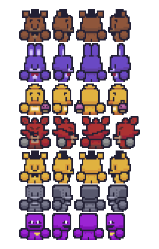 a row of cartoon characters including foxy bonnie and fredbear