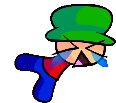 A character from Fnf Friday Night Funkin is shown crying with large tears, wearing a green top hat and blue pants.
