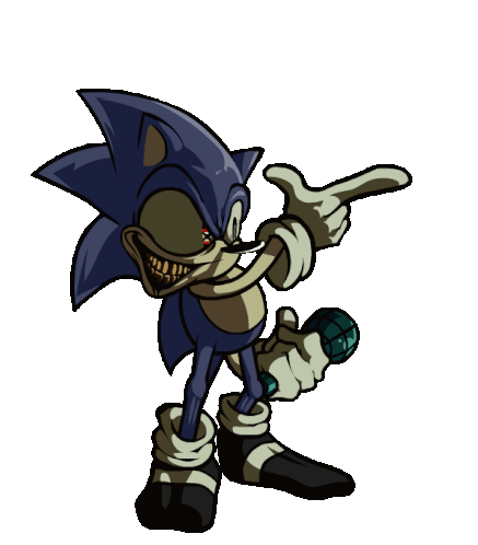 Fnf Lord X, a creepy Sonic.exe character, points and holds a microphone, ready for a rap battle.