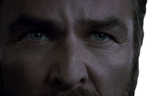 Chris Argent from Teen Wolf stares intently with a focused and serious expression, his blue eyes piercing.