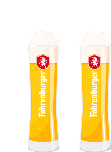 Two Fohrenburger beer glasses clink together in a celebratory toast, overflowing with golden beer and frothy foam.