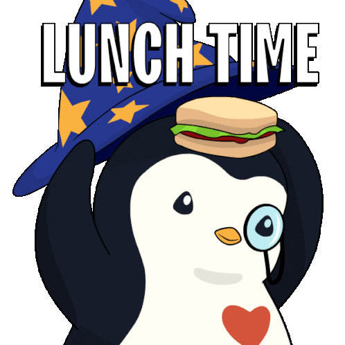 A cute wizard penguin wearing a star-patterned hat happily eats a sandwich, with "LUNCH TIME" text.