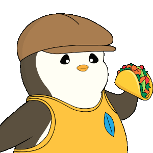 A Pudgy Penguin wearing a cap and tank top holds a delicious taco, ready for a flavorful meal.
