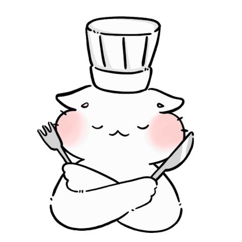 A cute, chubby white chef cat with rosy cheeks holds a fork and spoon, looking content and ready to cook.